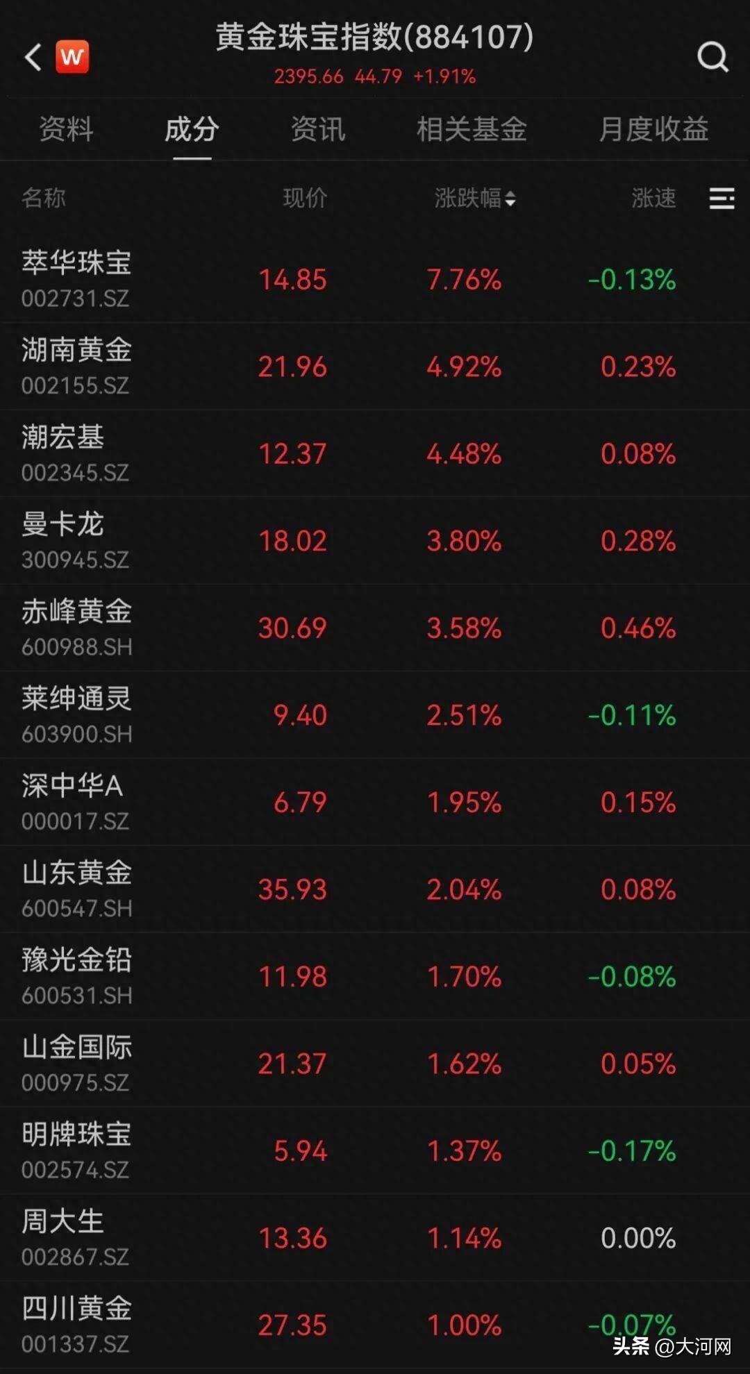 A股市场上,黄金股集体大涨。截至13时20分,黄金珠宝指数涨幅达1.91%。其中,萃华珠宝涨7.76%,湖南黄金涨4.92%,潮宏基涨4.48%融易富,曼卡龙等涨超3%。
